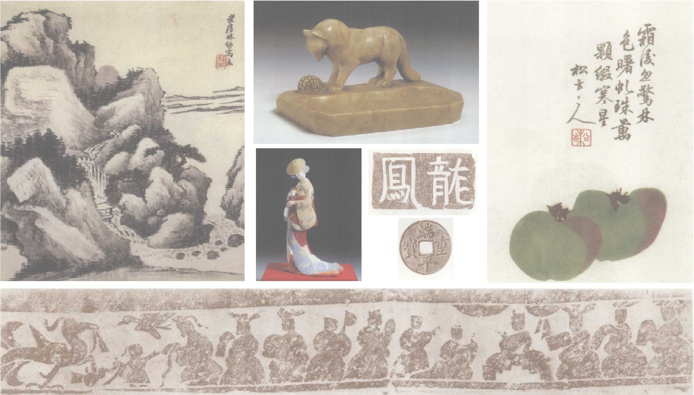 中欄自上而下分別為“石雕煙灰皿”、“龍鳳”磚拓片和“端平重寶”古錢?!笆駸熁颐蟆睘?936年楊之華托人從蘇聯帶給魯迅的,材料為南高加索烏拉爾山所產玉石,造型為北極狐;“龍鳳”磚拓片,1917年10月5日許壽裳帶來,魯迅判斷磚刻為東魏時期物品;古錢為1914年11月20日午后從地攤上慧眼撿漏的南宋“端平重寶”錢幣,僅以30銅元買下。