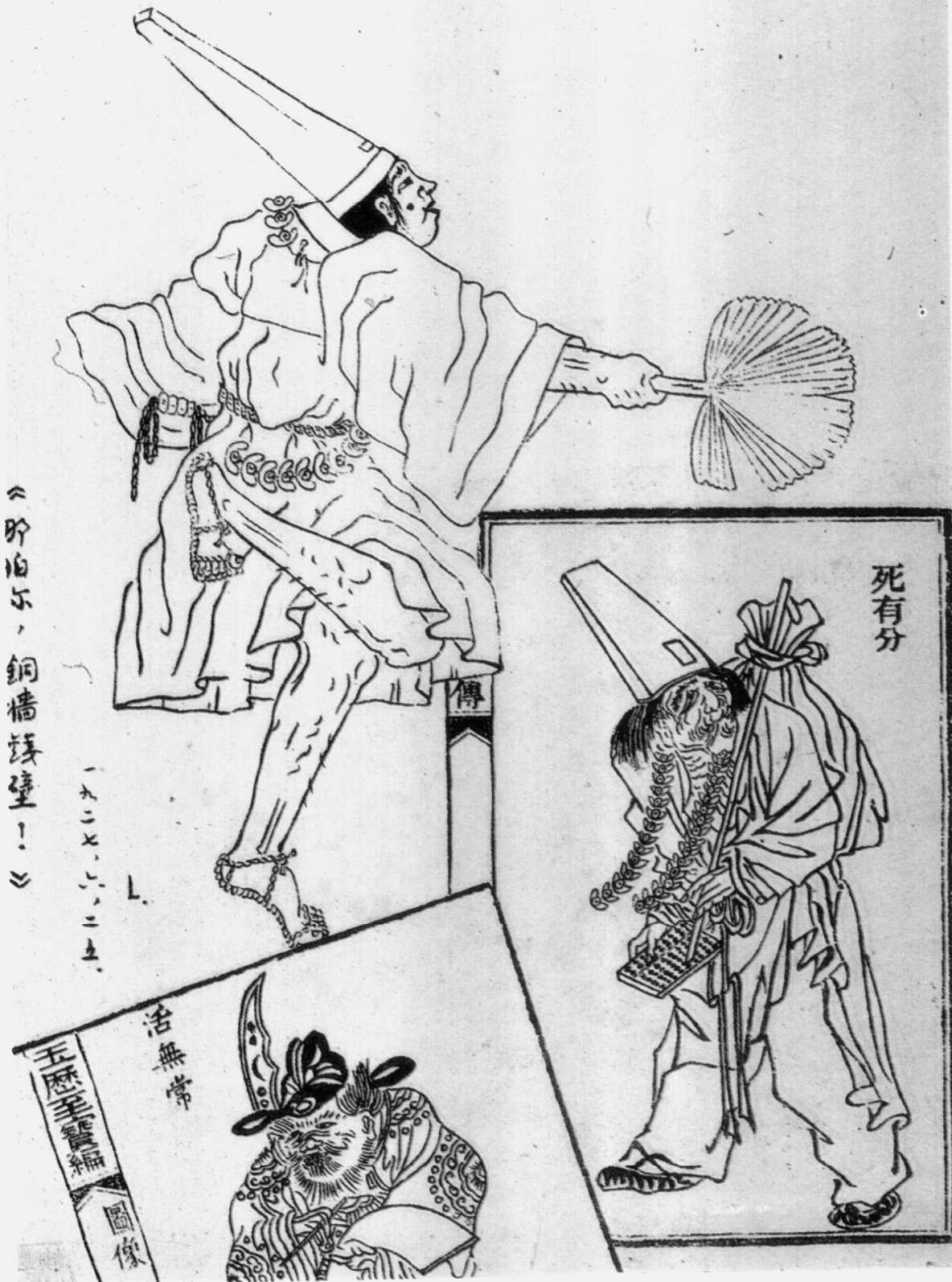 寫作《朝花夕拾》后記時,魯迅對兒時聽說的“無?!痹敿用枥L,并繪畫了一幅“無常圖”。上圖中上方為魯迅根據記憶中紹興迎神賽會中活無常的形象所繪制的畫作,下右側為魯迅從南京李光明莊本《玉歷鈔傳》中描出的“死有分”,下左側為魯迅從廣州寶經閣本《玉歷》中描出的“活無?!?。顯然,魯迅所繪更勝一籌。