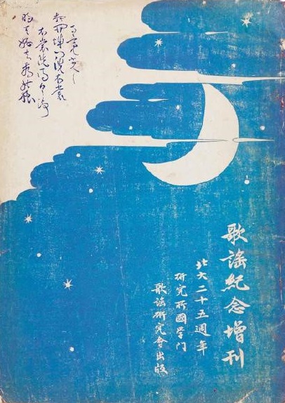 1923年,為紀念北大建校25周年,魯迅為《北大歌謠周刊》增刊繪制封面。增刊第一部分為“月歌集錄”,故魯迅設計封面底色為深藍色代指月夜,上有閑云斜月相襯。左上角為沈尹默手書兒歌《月亮光光》,“月亮光光,打開城門洗衣裳,衣裳洗得白白凈,明天好去看姑娘?!庇蚁鲁霭嬲f明為魯迅手跡。據?;荨痘貞涺斞赶壬?,“北大印刷科沒有銅板,只能用木板。把封面畫底稿貼在木板上再刻,因此魯迅先生這張封面底稿就沒有保留下來。經木刻工人刻了以后,先生原稿的精神沒有完全顯示出來,印出的封面比原稿差多了?!?/p>