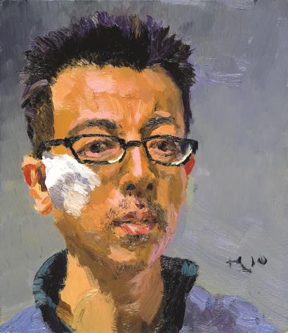 畫《小帥》時,北京正值桃花盛開的清明時節,畫中的王小帥坐在工作室陽臺上,面對著地上的巨大火盆,隨著炭火的溫度一點一點升高,早年一起拍電影的點滴往事仿佛也在此刻回溫。這對老友一起從青年步入中年,他們的兒女也已成長到了當時兩人相識的年紀,生命在平凡的日子中開啟了新的輪回。