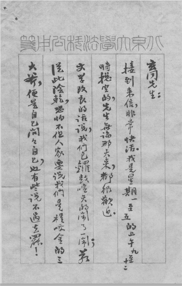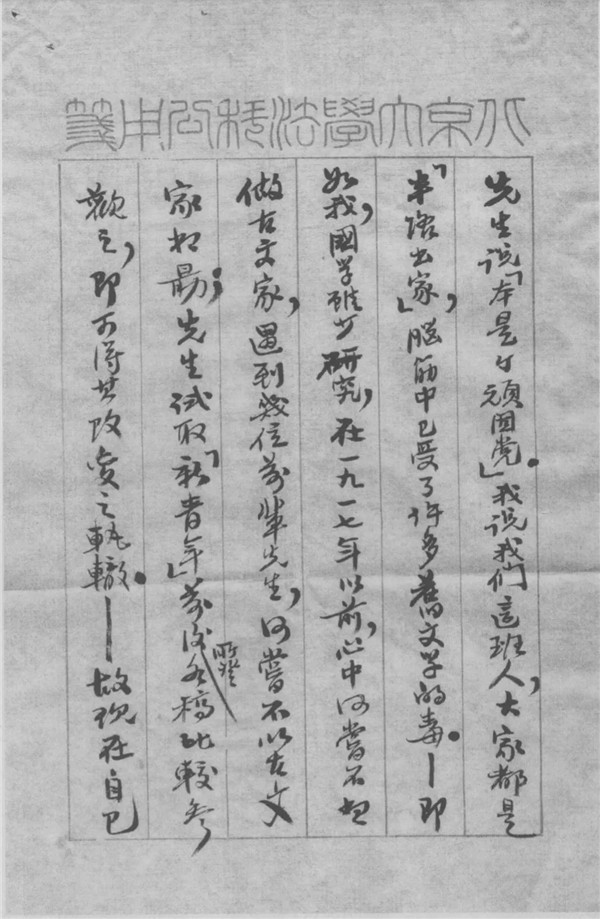 按:載北京魯迅博物館編《魯迅博物館藏近現代名家手札》(三),福建教育出版社2001年版,第210~214頁?;叶扔坝〖?。毛筆直行書寫,行書。凡五紙。信箋天頭印有“北京大學法科公用箋”篆字。