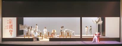 在舞臺中央緩緩打開的三面巨大“白墻”前,紅色邊框,把賈寶玉、林黛玉、薛寶釵、王熙鳳等人物一個個框進來,白與紅,也延伸到他們的服飾,昭示了基調和變奏的主題。