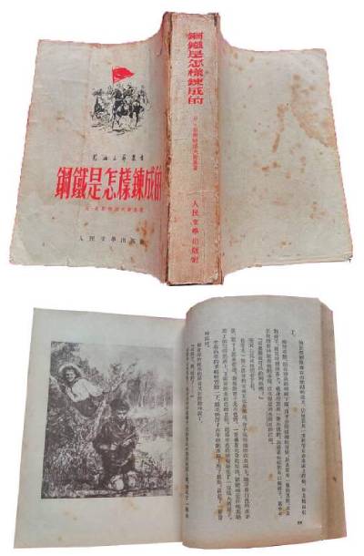人民文學出版社1952年出版的梅益譯《鋼鐵是怎樣煉成的》封面與內文插圖