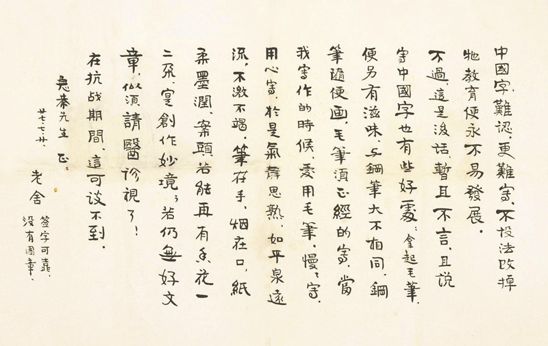 釋文:中國字難認,更難寫,不設法改掉它,教育便永不易發展。不過這是后話,暫且不言。且說寫中國字也有些好處,拿起毛筆便另有滋味,與鋼筆大不相同,鋼筆隨便畫,毛筆須正經的寫。當我寫作的時候,愛用毛筆慢慢寫,用心寫,于是氣靜思熟,如平泉遠流,不激不竭,筆在手,煙在口,紙柔墨潤,案頭若能再有魚花一二朵,實創作妙境,若仍無好文章,似須請醫診視了!在抗戰期間,這可談不到。
