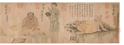 宋人《會昌九老圖》為絹本設色,由于年代久遠及保存條件欠佳,整卷作品比較暗淡,但仍不失為一件珍貴的宋代人物作品。畫題取自《新唐書·白居易傳》,講述了詩人白居易因直言朝政,被權貴所忌,遂棄官歸隱香山(今河南洛陽附近)。他自稱香山居士,曾于唐會昌五年(845)在家中與年高而不慕名利的胡杲、劉真、盧真、張渾等結成“九老會”,并請畫師繪圖紀念。畫中各段聚會場景被畫家通過庭園中的水榭、方亭、池岸、艤舟巧妙連接在一起,形成了類似電影鏡頭般的畫面。透過略顯“醬色”的絹本,觀眾可見老人們聽琴、弈棋、吟詩、觀畫等娛樂場景,表現了他們自甘淡泊、與世無爭的精神世界。
