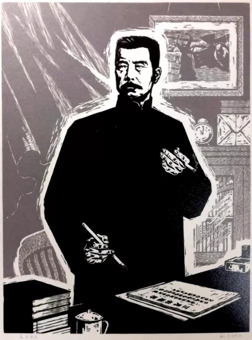 同樣的斗士形象,亦見于1976年范一辛所作的木刻《永遠進擊》(圖3)。此作中魯迅昂然而立,一手執筆一手夾煙,面色嚴肅,目視遠方。值得注意的是,圖像有意突出了魯迅正在寫作的文章:《三月的租界》。眾所周知,《三月的租界》是魯迅在1936年春為抨擊狄克(即張春橋)而作,四十年后這篇文章于圖像中出現在魯迅的書桌上,深意在焉。1976年的魯迅逝世紀念日《人民日報》發表社論《學習魯迅 永遠進擊》,文章指出:“我們要遵照毛主席的教導,緊密結合現實的階級斗爭和路線斗爭,讀點魯迅,學習和發揚魯迅的革命精神,向階級敵人,向修正主義,永遠進擊,長期作戰?!盵8]之后的10月21日,《人民日報》重發了魯迅的文章《三月的租界》,其義不言自明。范一辛此作,實際上呼應了其時的政治形勢。