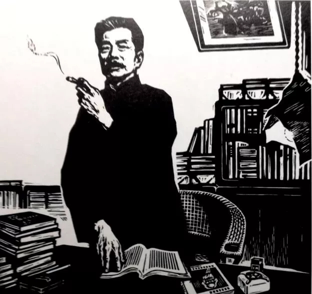 而魯迅則毋庸置疑地被樹立為了自我改造的榜樣。1951年魯迅逝世十五周年紀念日時,《人民日報》發表社論《學習魯迅,堅持思想斗爭!》指出:“當魯迅先生僅僅是一個進化論者的時候,他的勇敢曾經有時候伴著對于前途的迷惑。但在接受了馬克思列寧主義的真理以后,他就成了堅決的徹底的毫不懷疑的思想的戰士了?!盵10]知識分子的自我改造由此成為魯迅逝世紀念活動的題中之義。既然魯迅的自我改造是在馬列主義的指導下實現的,那么在美術家的筆下,魯迅作為自我改造模范的形象一定和馬列主義有密切的關聯?!墩J真學習馬列著作》(圖7)這幅油畫描繪的即是魯迅學習馬列著作的情景,畫面中魯迅劃燃火柴準備點煙,火柴已經燒完了半截,然而魯迅的目光卻依舊被桌子上攤開的書所吸引,遲遲不能移開。這個瞬間極為生動地表現出魯迅學習馬列著作的認真和投入。進一步地,能讓煙不離手的魯迅“廢煙忘點”的馬列著作,無疑具有巨大的價值和魅力,對魯迅產生著深刻的影響。李以泰的木刻《馬克思主義是最明快的哲學》(圖8)同樣表現了這一主題。圖畫中的魯迅一手擎煙一手按書,從容而立,凝神靜思,神情中滿是向往,頗有幾分沉醉于馬列著作中的微醺之色。很明顯,美術家們在圖像中表達出來的意蘊是,只有深刻、徹底地認同馬列主義,才能夠實現思想上的轉變,真正成為黨的一份子,或是黨的同路人。魯迅就是最典型、權威的榜樣。