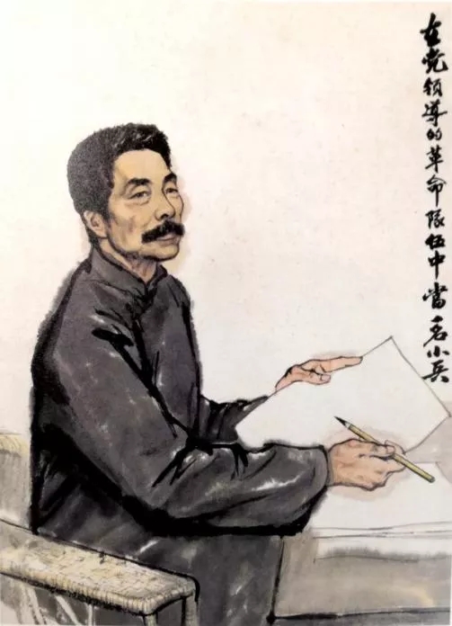 魯迅“黨的小兵”形象的塑造與馮雪峰關系甚大。1952年,馮雪峰如此回憶和魯迅相處的細節:有一天“在談到了我黨和毛主席以后”,魯迅“半向著坐在書桌旁邊的我,半向著窗子,一手橫在胸前托著另一只拿著紙煙的手的手肘,只是那么柔和地默默地微笑著,然后怡然自得地、又好象忘我地、緩慢平靜地說:‘我想,我做一個小兵是還勝任的,用筆!’”[11]之后的1959年,許廣平寫了《魯迅回憶錄》,更為明晰地刻畫出了“黨的一名小兵”的魯迅形象:大革命失敗后,魯迅“思想有了突變,從量變到了質變,于是他否定了進化論的偏頗,接受了馬列主義的真理,投入了階級斗爭的行列,他自己說愿意在黨領導的革命隊伍中當一名‘小兵’?!盵12]如此帶有個人感情色彩且具體細微的“回憶”,當然不僅是回憶。因為馮雪峰和許廣平都是魯迅的身邊人,這樣的回憶天然地具有真實感,于是,魯迅的小兵形象也就幾乎立竿見影地樹立起來了。蔣兆和1956年所作的魯迅像落款即是:“我想,我做一個小兵是還勝任的,用筆!馮雪峰同志回憶魯迅先生語,一九五六年兆和?!敝芩悸斠矂撟鬟^相同主題的作品(圖9),畫像的題名是“在黨領導的革命隊伍中當一名小兵”,畫中的魯迅手拿紙筆,坐于桌前,抬頭凝望著遠處,似在思索如何下筆。他的神態中幾乎沒有常見的戰斗性,并充滿了慈和平靜以及對遠方的向往。畫面沒有采取通常的仰視視角,而是選擇了容易縮小人物、表現人物向往姿態的略顯俯視的視角,這就不難理解畫家的在構圖上的良苦用心了——在黨的隊伍中,魯迅就是順從于黨、聽命于黨的一個小兵。