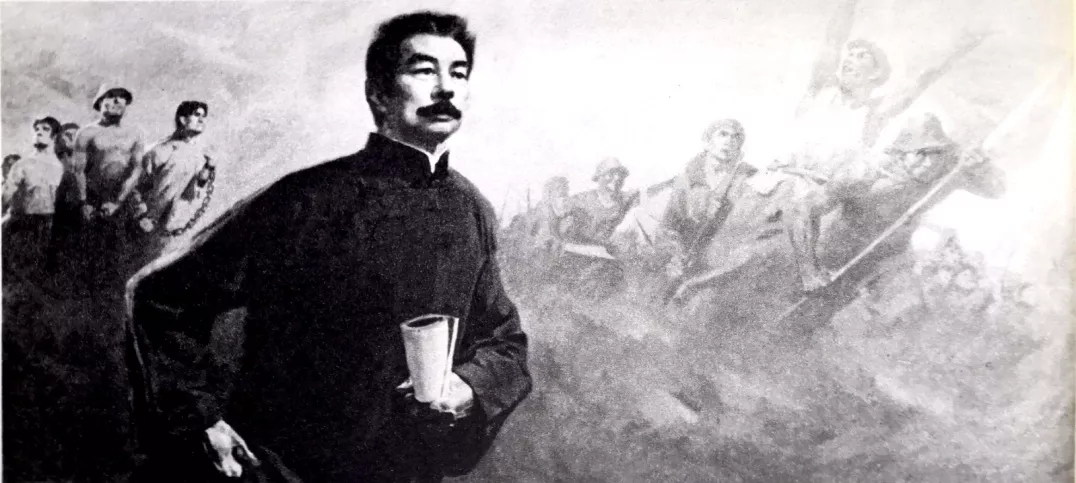 這首先表現在整體構圖方面。其時的魯迅圖像有著不少的構圖方式,但在總體上這些構圖可概括為“高、前、亮”式。具體來說,圖像中的魯迅,幾乎無一例外地身材魁梧、英偉高大,即便不是充滿了力量感也頗能見出沉穩大氣之態,而且往往處于畫面的最前端的中心位置,畫面占比最大,聚焦效果最好。比如在黃新波的木刻《心事浩茫連廣宇》(圖13)中,占據畫面中心的魯迅雖是半身,然形體之偉岸自是毋庸贅言。李瑞祥的作品《惟新興的無產階級才有將來》(圖14)中,魯迅處于視覺中心位置,也遠比其他背景人物高大。經過這樣的放大、置前和增亮,圖像中的魯迅無聲地顯示著權威地位。并且,美術家們在描繪魯迅時經常采用的是仰視視角,即讓觀者處于魯迅的“下方”,這在無形中產生一種威壓之感,魯迅的“權威”也就更能直抵人心。