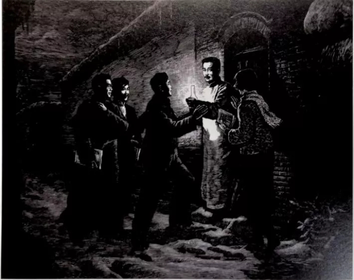 一般而言,圖像的敘事是共時的,若想在故事發生的瞬間完成敘事任務達到表達目的,就需要選取最有表現力的時刻。這一時刻繼承著上面故事的發展,也孕育著故事的后續進行,也就是萊辛所說的有“最大效果”的“頃刻”。美術家們在處理魯迅所在的場景時,選取的常常都是此種時刻,也使得畫面更能引人注目,進而在不動聲色間塑造起魯迅的權威形象。