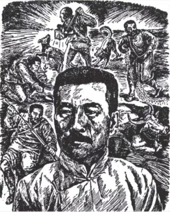 在不同魯迅圖像中具有內在同一性的還有背景設置。背景很多時候和場景是并為一體的,但在非敘事性的魯迅圖像中,背景常被設計為具有特別意義的符號元素。以此,美術家們的創作動機和意圖才會更顯明地體現出來,魯迅肖像才可能得到觀者的貼切認識和理解。在陳煙橋1948年創作的《魯迅》(圖21)中,神情凝重、悲憫滿面的魯迅背后,是舊中國底層民眾生存的慘象。橫行的狗、被縛著的人以及軍閥的槍,都在無聲地控訴著其時的社會時局。魯迅的反抗性和革命性由此得以凸顯。黃新波的《心事浩茫連廣宇》(圖13)中,背景則更富政治隱喻意味。在魯迅手中作為“武器”的筆,似已幻化為了真正的槍,牽引著勝利的旗幟;左上角大放光芒的五角星則明示,魯迅是在馬克思主義引領下的無產階級的一員。有了武器和馬克思主義的加持,已是權威的魯迅更是戰無不勝。