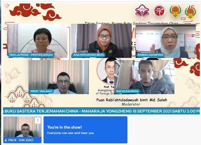 9月18日,由馬來西亞教育部國家語文局、馬來西亞作家基金會和馬來西亞漢文化中心聯合主辦的“中國文學讀者俱樂部·當代中國文學讀書會”在線舉行,分享中國作家二月河的作品《雍正皇帝·九王奪嫡》。小說的馬來語譯者鄭麗萍和廣東外語外貿大學東方語言文化學院副院長談笑教授作為主講人參加讀書會,吸引馬來語主流讀者和在校學生近1000人觀看。