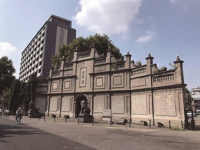 經歷了100多年的風雨滄桑,江南水師學堂的部分建筑依然保留了下來,以“江南水師學堂遺跡”之名被列為省級文物保護單位,現存當年的英籍教官樓、四合院式寢室、講堂、半邊亭、長廊、牌樓式大門等建筑,另外還有“槍炮”“魚雷”等石刻門額。最為引人注目的是中山北路346號門前的那座牌樓式大門,平面呈圓弧形,立面均勻分布十根裝飾門柱。從門樓正中頂部開始,設有斜向兩側的層層退臺,共有五層,上面裝飾有具有動感的、巴洛克風格的曲線漩渦花紋,旁邊一左一右還矗立著兩只威武的石獅。