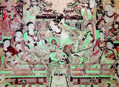 走進復制的莫高窟第220窟,一定要仔細看看北壁的樂舞圖。它繪制于初唐,是唐代壁畫中最具代表性的,描繪了佛國世界伎樂天奏樂歌舞的場景。畫面正中有一座燈樓,兩側各立一樹燈輪;左右兩廂置樂隊,共28人,分為兩組,演奏來自中原和西域的各種打擊、吹奏、彈撥樂器;兩對舞伎在小圓毯上旋轉騰踏,巾帛飛揚,跳著唐代盛行的胡旋舞。
