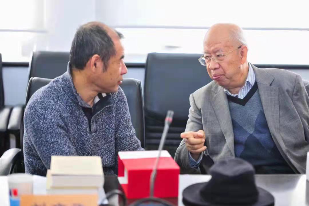 葉老師是9月27日6時離世的,這兩天,網上流傳著大量緬懷葉老師的文章和葉老師的遺文遺像。在漓江出版社推送的《深切緬懷:翻譯家、德語文學研究專家、卡夫卡研究專家葉廷芳先生》的文章中,我驚喜地看到了我與葉老師的一張合影。我之前沒有見過這張照片,拍攝地點是中國社科院外文所,時間是2018年12月,當時我和葉老師一起參加漓江出版社舉辦的《春潮漫卷書香永——開放聲中書人書事書信選》(劉碩良先生主編)出版座談會。照片上的葉老師抬起手,在對我說著什么。這可能是我與葉老師的最后一張合影。