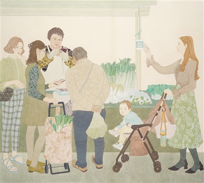 互聯網既為交通運輸市場增添了活力,也顯著提升了人們日常消費的便捷度。像王琨中國畫《智享新生活》、盧沛中國畫《掃碼生活》等作品,均聚焦人們用手機掃描商鋪二維碼購買蔬果的場景。移動支付的便捷性在作品的小切口中體現得淋漓盡致。