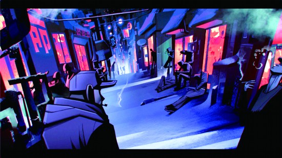 《冰》在動畫設計上運用了“三渲二”的手法,即使用三維軟件進行模型和場景的搭建,但最終卻渲染出二維動畫的效果。我們都知道,三維動畫最大的優勢就是對真實空間的模擬。這種模擬體現在三維軟件對真實世界透視準確的捕捉,以及在視覺表現層面對真實感的渲染。不過,三維動畫的“絕對逼真”已逐漸令觀眾和創作者產生了審美疲勞——二維動畫展示的逼真性雖然達不到100%準確,卻因其形式上強烈的手繪感而更加富有藝術表現力。在計算機圖形學專家針對“非真實感渲染”的研究取得較大進展之后,這一將渲染風格從“擬真”轉移到“風格化”的圖形學技術讓更多的三維動畫產生了頗具表現力的渲染風格?!吨┲雮b之平行宇宙》就是一個用“三渲二”方法渲染出風格化畫面的絕佳例子。在《冰》中,為了渲染出美式漫畫中粗黑邊線的視覺風格,設計師為角色創建了塊面分明的模型,并在模型的關鍵位置勾出模仿漫畫的黑線。同時,影片通過大量使用廣角鏡頭,造成了一種人物傾斜、透視不準確的錯覺。筆者猜測,這一錯覺的營造是為了令觀眾更加信服這是一部手繪動畫,因為手繪的呈現效果往往帶有一種不準確性。