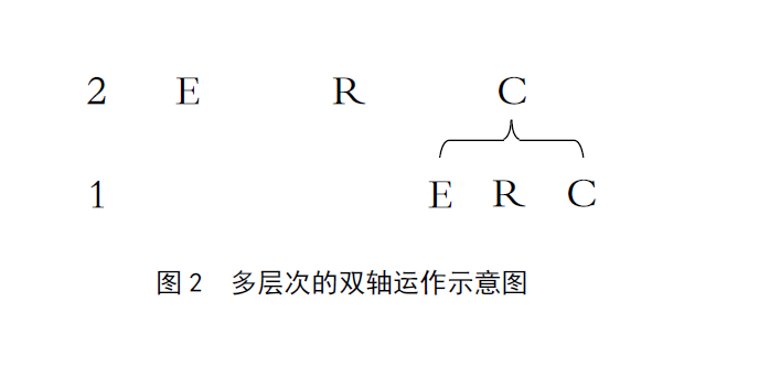 我們的表達習慣往往是在聚合軸上只做一個選擇,正如希爾弗曼所言:“聚合關系中的符號,選擇某一個,就是排除了其他”,以求實現某種意圖和目的(intention and purpose)。33而《來勁》在聚合軸上羅列了多個,表面看起來文本未在聚合軸上做選擇,但其實是采用了“多層次的雙軸運作”34,即一套符號文本有多層次的選擇組合關系。這種多層次的雙軸運作與單層次的雙軸運作一樣,沒有時間上的先后,只有邏輯上的前后,都是同時進行的。如前文所列舉的《來勁》中各類出行方式及其情景,讀者如果要理解文本,就必須再在作者所并置的聚合軸因素中做出選擇,就像是飯店老板列出了菜單,主人公的名字、出行方式、所見所聞所感都有多種選項并置在讀者眼前,讀者若要從中獲取某種意義解釋,則必須從菜單上列出的聚合中做出下一層次的選擇與組合,最終呈現為一桌合意的佳肴。菜單和一桌飯菜是兩個層次的雙軸運作的結果,這便出現了巴爾特所言的兩套組合文本,兩個文本之間是重疊的,根據巴爾特的表述,我們可以對這種“多層次的雙軸運作”作如下圖示: