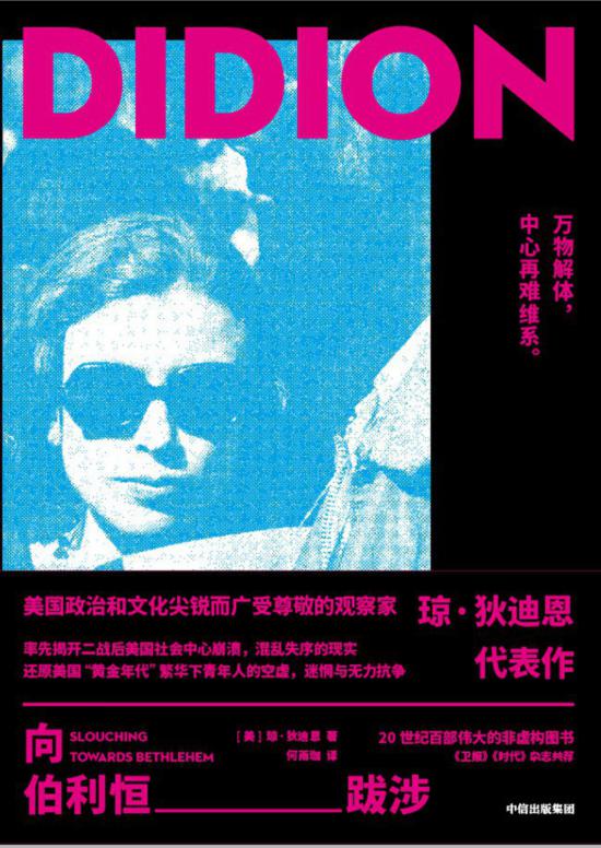 1956年,狄迪恩從加州大學伯克利分校畢業,之后一直擔任《時尚》雜志的特寫編輯,直到1963年。1968年,34歲的狄迪恩出版非虛構文集《向伯利恒跋涉》,可以說是她最為人稱道的作品,被《紐約時報》譽為“一部豐富的作品,呈現出美國當下最出色的散文書寫”?!跋虿惆仙妗比∽匀~芝名詩《第二次降臨》的結句,“然后是怎樣兇暴的巨獸,終于輪到了它的時日,/正疲沓地走向伯利恒去投生?”在《白色相冊》《薩爾瓦多》等報道文集中,記錄了美國社會、政治、文化等方面的現實狀況。1973年,湯姆·沃爾夫將狄迪恩納入文集《新新聞主義》,同時收錄的還有杜魯門·卡波特、喬治·普林普頓、蓋伊·特立斯等人。