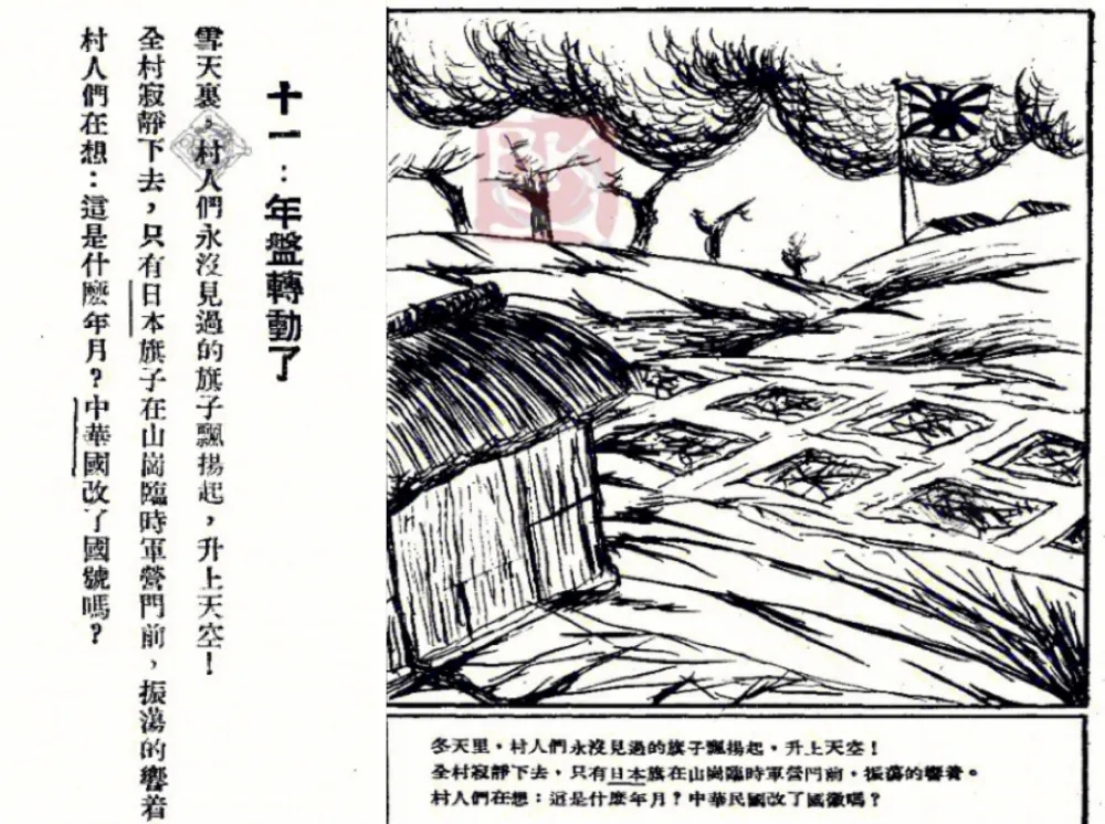 左側為《生死場》第十一章《年盤轉動了》;右側為1939年上海華盛頓出版公司出版的由張鴻飛繪制的圖畫版《生死場》的相關內容,圖中近景為荒蕪的麥田,遠景為侵略者的旗子