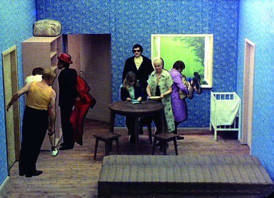 根據瑞比克金斯基的公司官網資料顯示,為了創作《探戈》,他花費了大量精力進行人工逐幀處理——手動摳像,再手動合成。這難免會使這部短片的視覺效果有一定瑕疵。瑞比克金斯基自己坦言,人物周圍有可見的黑色邊線,膠片材料的不穩定也導致了抖動,燈光色溫的波動影響了顏色的統一。為了讓36個人的行動軌跡在狹小的房間里互不影響,瑞比克金斯基對人物的姿態序列在時間軸上進行了微調,于是《探戈》最后呈現出角色動態有時略快、有時略慢的狀況。也正因為這個原因,雖然筆者更愿意將其歸為以實拍為基底的作品,但畢竟它踩在了動畫與實拍兩種影像類別的邊線上——瑞比克金斯基自己甚至將其稱作“實拍動畫”(live action animation)這種怪名字——因此在這里我們不妨以動畫視角來審視該短片。
