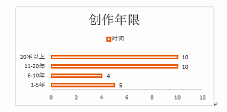 我們將年齡劃分為三個區間,可以看到作者的年齡跨度較大,年齡最小的尚在讀高中,一邊學習,一邊寫作,從事文學創作僅一年。年齡最大的創作至今已有20年。但這也還不是這群作者中創作年限最長的,有人已經有近40年創作歷史,所有作者中有大約三分之二創作年限都在10年以上,可以稱得上是比較有經驗的寫作者了。