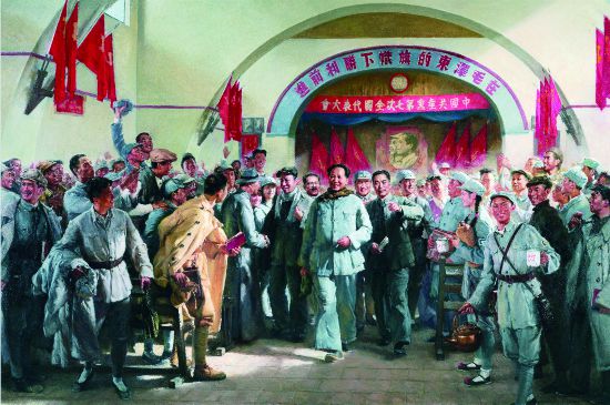 從《紅潮——五四運動》《南陳北李》到《開天辟地》,從《遵義會議》《勝利會師》到《抗日烽火》,從《遼沈戰役》《開國大典》到《第一部憲法》,從《第十一屆三中全會》《加入世貿》到《飛天圓夢》,這些作品尺幅巨大、場景開闊、人物眾多,將歷史風云與人物塑造融為一體,既體現了歷史畫宏大敘事的造型藝術傳統,也體現了多維空間組合、多種圖像隱喻的當代藝術創造。歷史畫創作的當代價值不止于對歷史真實原本的視覺再現,更在于每個時代、每個藝術家對于歷史真實的發掘與重釋。這些在建黨百年之際創作的歷史畫,在視覺特征、藝術構思和人物形象塑造等方面,無不體現了新時代文化自覺的精神性與時代感。