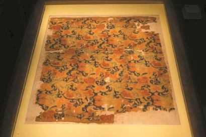 從絲綢作為重要物資的對外交流來看,在西域以及更西邊的世界中,都留下了漢式經錦多彩的印記。秦漢時期,帝王特別重視祭天地儀式,秦始皇、漢武帝等都曾登臨泰山舉行過封禪大典,因此漢錦上也以超凡脫俗的云氣和珍禽異獸形象彰顯時代特征。漢式“云氣動物紋錦”有相對固定的色彩搭配和紋樣組合,遵循陰陽五行學說的五色顯花、連綿如山的云紋、現實或想象中的動物以及穿插其中的寄托美好愿望的銘文。如此精美且蘊含中國古典哲學核心思想的衣料也是不可替代的高檔禮品選項。尼雅遺址高規格主墓中出土的“五星出東方利中國”錦,被制作成了當地人狩獵時必備的護膊,很有可能就是產自蜀地遠行西域的經典之作。仔細一看,在這件織錦上游走于祥瑞云氣間的還有鴕鳥、孔雀等非中原地區出產的動物。與之相近的時期,葡萄、猛獸捕獵等外來元素紋樣也躍然綢上。絲路開通之后多方文化互通有無,交相輝映的盛況時見一斑。