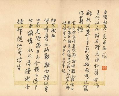 日前韓超君示我謝無量先生詩冊一冊,線裝,35個筒子頁,外加封題一頁,為甲申年即1944年在成都時所書,后題贈佘雪曼者。謝無量是庚辰年即1940年冬,自香港經重慶到成都,后居成都并游歷、講學周邊如樂山復性書院(其總角之交馬一浮創辦)、青城山、江油、雅安等地。此期作詩甚多,且一再書之,曾寓目者如1987年中國文聯出版公司《謝無量自寫書卷》,是寫贈蜀中學者李國瑜(后任教西南民族學院漢語文系)的,共錄詩75首詩;又有保利2012年12月的“古籍文獻名家翰墨專場”、上海書畫出版社2017年《神霄真逸》所收、《書法》2018年第5期所刊《謝無量書法》等,知為其得意之作。