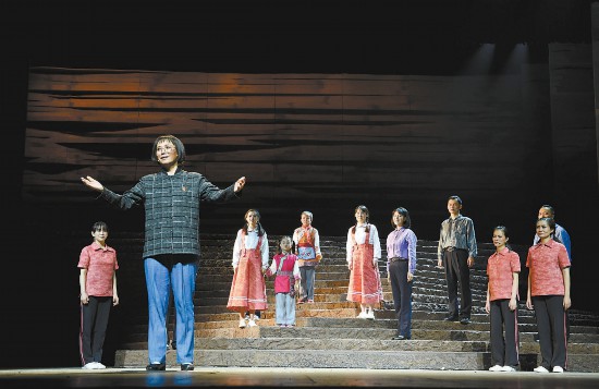 “同學們:我愛你們,我想你們,我等你們?!痹谘莩鲩_始和結尾,這幾句寫在黑板上的質樸言語,道出了桂梅老師幾十年來對學生們最真摯的守候。12位演員分別扮演張桂梅的同事、學生,在舞臺上運用宣講歌隊的形式完成場與場的空間切換,在講述桂梅老師故事的時候則有往事重演、時光穿越式的展示。她免費擔任華坪兒童福利院院長,成為百余名孤兒的“媽媽”;她頂著重重壓力,克服種種困難創辦了免費女子高中;她在昆明街頭為創辦學校募資,風餐露宿四處奔波;為了把錢留給孩子們,她穿著破洞褲子參加黨代會引起記者關注;她身上幾十種病痛,甚至曾鬼門關走一遭,也擋不住她拯救山里孩子的決心,她對孩子們的愛,溫柔且堅定,只為守候心中那片熱土。演出中,不少觀眾沉浸在桂梅老師的動人事跡中,潸然淚下。