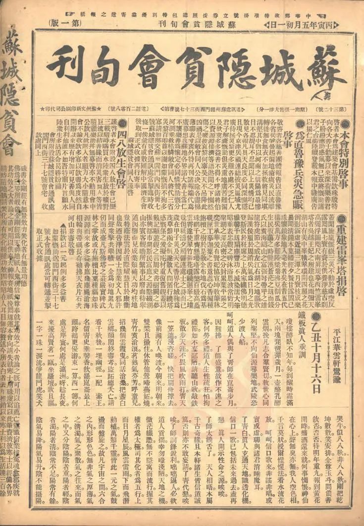 《蘇城隱貧會旬刊》刊載《重建雷峰塔捐啟》(第32期)