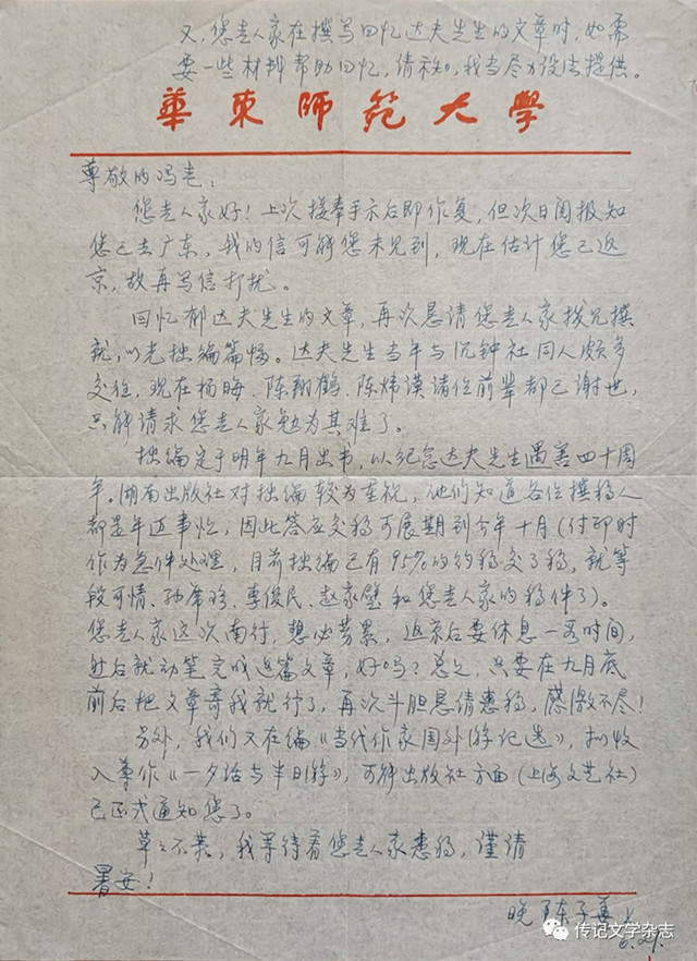 回憶郁達夫先生的文章,再次懇請您老人家撥冗撰就,以光拙編篇幅。達夫先生當年與沉鐘社同人頗多交往,現在楊晦、陳翔鶴、陳煒謨諸位前輩都已謝世,只能請求您老人家勉為其難了。