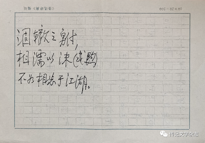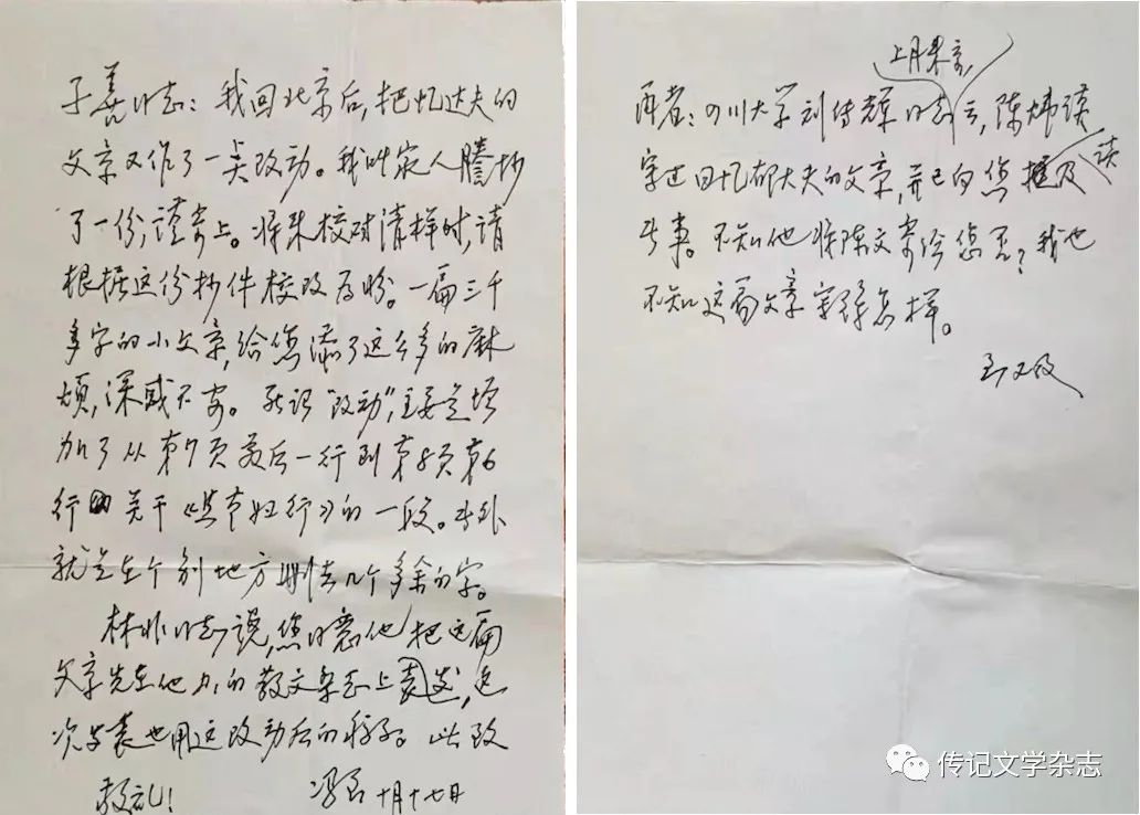 我回北京后,把憶達夫的文章又作了一點改動。我叫家人謄抄了一份,謹寄上。將來校對清樣時,請根據這份抄件校改為盼。一篇三千多字的小文章,給您添了這么多的麻煩,深感不安。所謂“改動”,主要是增加了從第7頁最后一行到第8頁第6行關于《焦節婦行》的一段。此外就是在個別地方刪去幾個多余的字。