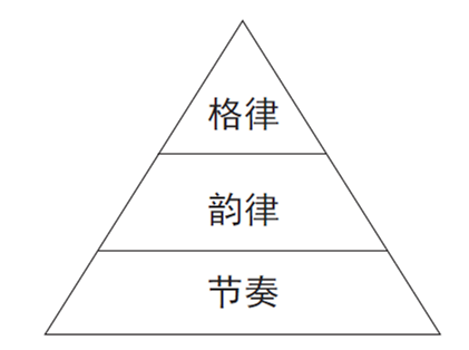 在區分了“格律”與“節奏”外延上的廣狹區別之后,就有必要再討論一下它們在內涵上有何區別與聯系,并思考“格律”與“節奏”之間的互動在歷史中是如何展開的,即“格律”是如何在“節奏”的基礎上一步步產生的;而到了現代,為何又被很多語種的詩歌(包括漢語)普遍地廢棄的。關于這個問題,帕斯有精到的觀察:“格律源自節奏,也會返回到節奏。最初,兩者的界限是模糊不清的。爾后,格律凝結成固定的模式。這既是它光輝的時代,也是它僵化的末世。當韻文脫離了語言的漲潮與落潮,就蛻變成了聲響度量。和諧之后,便是僵化……”42可以進一步說,如果說韻律是種種詩歌聲音的規律性和原則的總稱話,那么格律則是這些原則中的一部分在詩歌史中凝結成的固定的、約定性的體系,因此也是歷史性的,相對的;而非格律的韻律則是寫作中自發形成的不固定的原則與方法。正是在這一意義上,T. S. 艾略特斷言:“一個韻律學(prosody)體系不過是一系列相互影響的詩人的節奏所具有的共同點的程式化(formulation)而已?!彼赋觯骸白杂稍娛菍┧赖男问降姆磁?,也是對新形式的到來和舊形式的更新所作的準備?!?3從這些認識出發,我們可以將“節奏”“韻律”“格律”三者的關系以一個金字塔圖示: