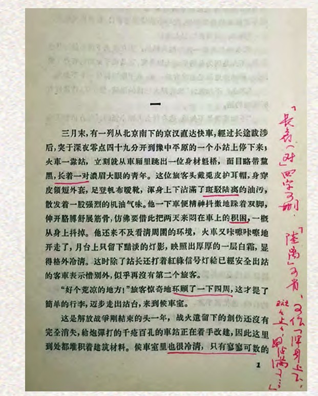 20世紀60年代初,關于茅盾先生的評論創作形成這樣一種流程:閱讀留下眉批、批注、札記—整理加工眉批為手稿—修改定稿為印刷稿—公開發表或宣讀[4]。在閱讀過程中,茅盾先生秉承了這一時期的閱讀眉批批注習慣,一邊讀一邊點評、批注[5],書中留下了十分詳細的批注,有關于細節的畫線、批注,還有關于章節的整體評論。