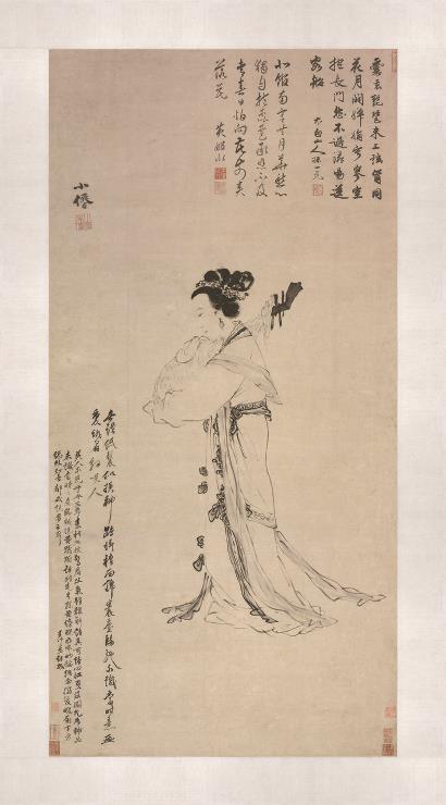 兩位畫家筆下的女子都不能算是寫實。揚之水老師教給我:明代女子多戴發罩,高髻并不常見,這樣的發型大體出自晚期畫家對于早期古代女性形象的模式化創造。但郭詡所畫的那一位,衣紋中有一些似是而非的“團窠花”模樣,近于唐風而遠于明式。盡管那所謂的唐韻,也是想象多而實據少。這么看來,吳偉草草留白,是因為他不需要暗示畫中人出自哪朝哪代;而郭詡添筆之際,心中或有個模糊的意圖,要讓人相信“她”從唐朝走來。