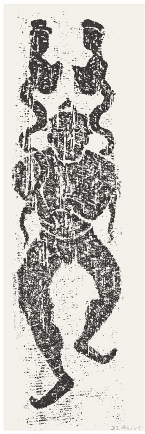 西漢中期,祠“高禖”祈子的風俗已上升為禮制。如司馬彪《后漢書志·禮儀上》記:“仲春之月,立高禖祠于城南,祀于特牲?!弊⒃唬骸皾h武帝晚得太子,始為立高禖之祠。高禖者,人之先也。故立石為主,祀以太牢?!睆拇罅看媸赖臐h畫像磚石上,可找尋到祭祀高禖的場景。如徐州銅山漢畫像磚拓片,該漢畫雕刻怪神高禖。兩邊有伏羲女媧兩尾相交纏繞,左邊二玉兔搗藥,右邊二神似抬物送饌,下邊刻繪二神獸相向用嘴高舉建鼓,二人邊鼓邊舞。左邊一人在弄丸,右邊二人在格斗。羽葆上神獸嬉戲追逐跳躍。兩邊各有衣冠整潔的官人在觀賞雜技表演和視聽仆人侍候進諫。