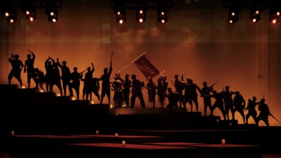 話劇舞臺設計以形似摩爾斯密碼的白色模塊群構成,它既是通訊兵的戰場,也是戰士們艱難駐守的白馬山,舞臺置景與人物表演都充分顯示出寫實寫意的融合。迷霧繚繞、硝煙四起的舞臺在光影之間旋轉流動,將三團官兵與日偽激烈交戰、我方深陷險境表現盡出。這一舞臺設計理念不拘泥于現實主義的寫實感,而帶有濃厚的象征主義色彩。再如腿摔傷的李安本站在兩根竹竿之間,即模擬了人物坐在滑竿上被抬上山的感覺,又帶有傳統戲曲的寫意特色;劇中犧牲的英雄們以獨白方式在舞臺上傾訴心聲、講述各自的生命前史,則有著強烈的表現主義意味。不拘泥于寫實局限的舞臺表現手段,應該說大大豐富了作品的精神意蘊與美學風格。