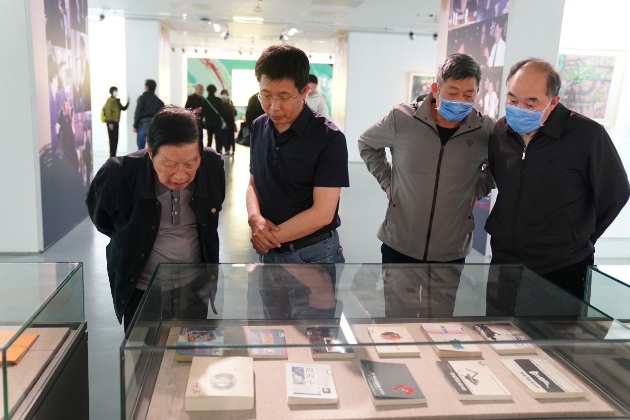 (右起)耿識博、吳著友、梁飛、周明等駐足觀看舒乙先生著作展示