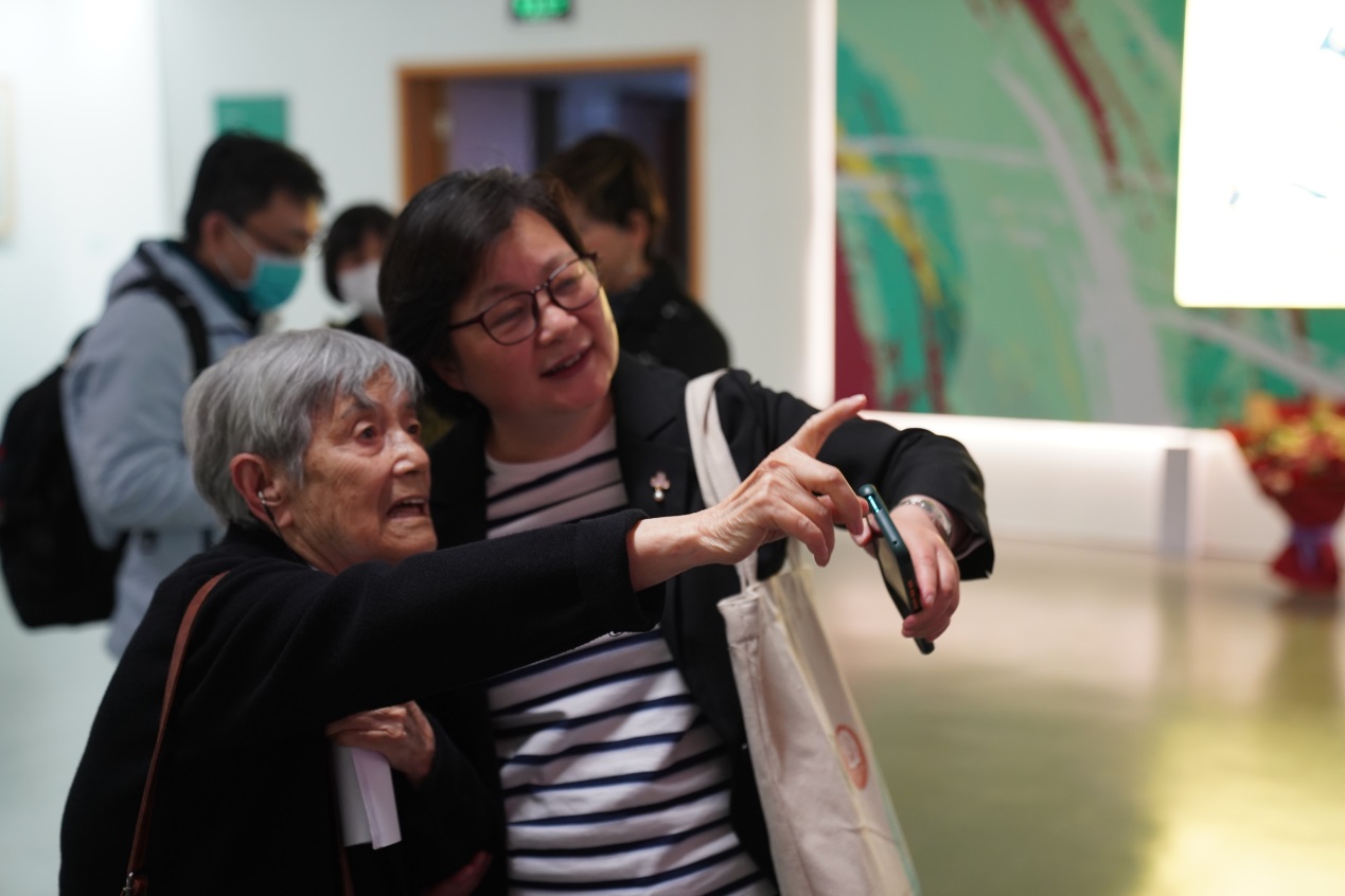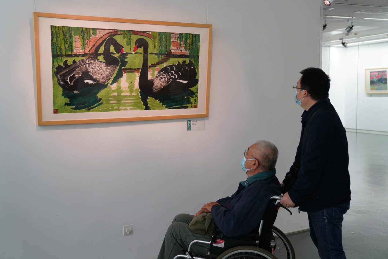 中國老舍研究會原會長、老舍研究專家關紀新坐在輪椅上細賞每幅畫作