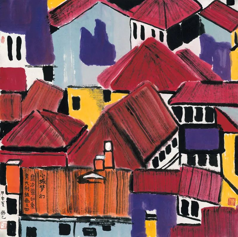 《小城夢幻》,舒乙繪于2004年夏,82cm×82cm。畫作上題記,“翡冷翠印象,意大利組畫之四”。