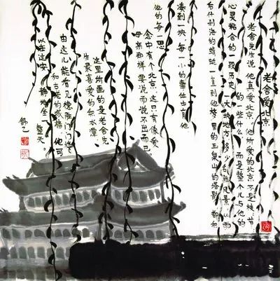 《老舍愛北京》,舒乙繪,82cm×82cm。這幅畫的題記中,舒乙先生寫下父親老舍的北京情緣:“老舍先生說,他真愛北京,他所愛的北京不是枝枝節節的一些什么,而是整個兒與他的心靈粘合的一段歷史,一大塊地方,多少名勝風景,從雨后什剎海的蜻蜓一直到他夢里的玉泉山的塔影,都積湊到一塊,每一小的事件中有他,而他的每一思念中有個北京,這只有像愛母親那樣要說而說不出而已。這里所畫的是老舍先生最喜愛的積水潭,由這兒能看見德勝門門樓和古老的城墻,他可以在這安靜地坐一整天?!?/span>