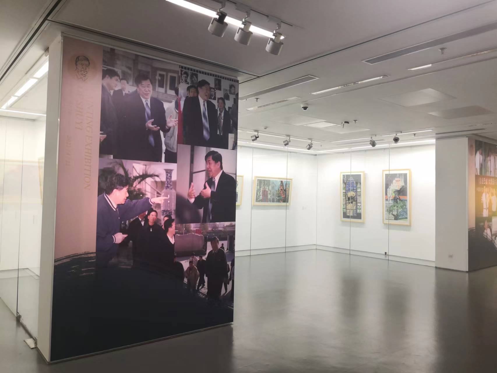 展廳一角。舒乙先生畫作與他在文學館工作期間的工作照交替排列。