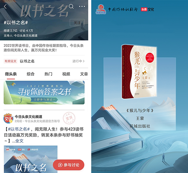 與今日頭條文化頻道發起的“以書之名”世界讀書日特別活動,開展讀書征文、發表閱讀心得,目前話題全網閱讀量已突破3億,4.6萬人參與討論。