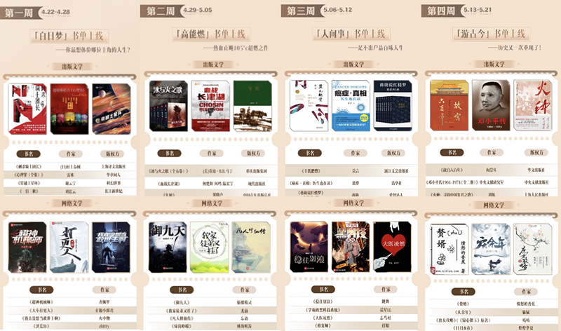 為迎接即將到來的第27個世界讀書日,閱文集團聯合國家圖書館、上海圖書館以及人民文學出版社、人民郵電出版社、北京大學出版社、中國青年出版總社等100家出版單位共推全民閱讀。4月22日至5月21日,閱文集團旗下起點讀書APP開啟“全民閱讀月”,首次限免200本付費好書,覆蓋文學、小說、傳記、經濟等20余大品類。國家圖書館文津圖書獎部分好書也將同步限時免費開放。