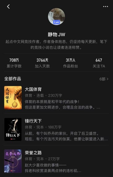 2012年,一直閱讀網絡小說的靜物,想賺點稿費養活自己,為家里減輕點負擔,開始摸索著在起點中文網創作體育競技小說。