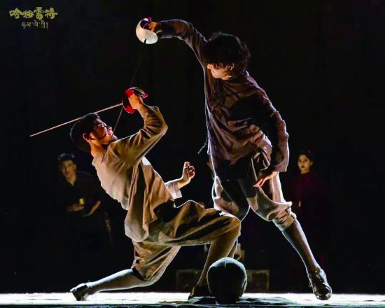 全戲最能凸顯藏族氣質的場景當屬雷歐提斯與哈姆雷特最后的決斗。二人劍拔弩張,藏族青年演員的民族血氣在此刻發揮得淋漓盡致。從激烈打斗到最后一一倒下,每個動作、每場交鋒都極具力量感與爆發力,緊緊牽動著觀眾的心。最后二人紛紛倒下,在死亡即將來臨的時刻,他們抬起頭,向上天言說著,他們仿佛看到了頭頂盤旋的禿鷲,兩位英勇青年的死亡有種莫名的蒼涼感。除了決斗橋段外,哈姆雷特的獨白也被藏族演員扎西邊巴羅布(普通話版)和頓珠次仁(藏語版)演繹得十分出彩。藏族演員在表演“生存還是毀滅”的大段獨白之時,每一個肢體動作都傳遞著哈姆雷特的掙扎與無力。身體與言語的共振式闡釋讓原本枯燥的大段獨白深入人心,觀眾們仿佛能與哈姆雷特此刻的猶豫與痛苦共情。盡管兩位藏族演員的普通話還不夠標準,臺詞說起來過快,但他們在舞臺上奪人眼球的肢體表達足以彌補這一瑕疵。
