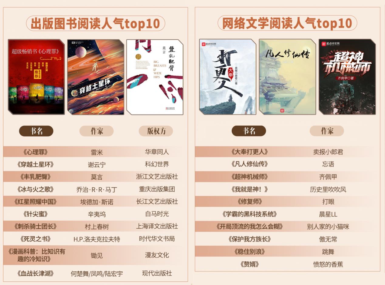 “全民閱讀月”出版圖書和網絡文學閱讀人氣Top10