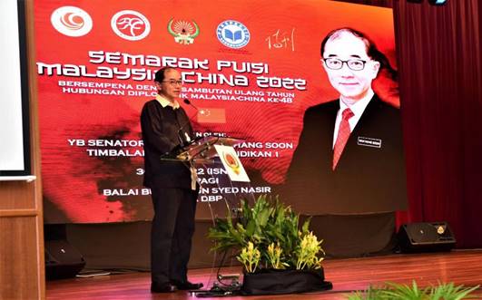 馬來西亞教育部副部長馬漢順在致辭中表示,馬來西亞教育部歡迎并全力支持以任何形式促進馬中長期友好合作的項目,本次詩歌朗誦會必將進一步弘揚兩國文化和文學交流,增強兩國人民的聯系與友誼。中國文學讀者俱樂部負責人、漢文化中心主席吳恒燦在致辭中表示,“詩可言志,詩可會友”,希望通過詩歌朗誦會,以兩國人民各自的語言抒發感情,增進友誼,發揮詩歌凈化人心的力量。
