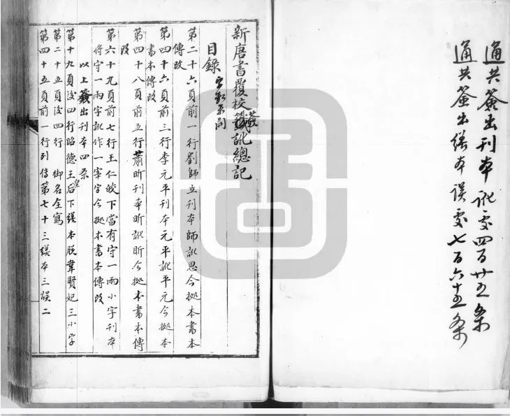 頗為吊詭的是,《校檔》中書名題署為“新唐書復校簽訛總記”的一頁上還題有“(乾?。┧氖辏┲廖逶鲁醢巳珍N訖,送總裁,發下銷訖,又查存疑簽,辦過一半”(見圖4),據此可知,《校檔》于乾隆四十六年五月仍在四庫館銷簽,因而纂定時間必當延續至此。又查《四庫全書薈要》史部正史類收錄《新唐書》,其提要的校上時間為乾隆四十二年正月[10],是知《新唐書》于乾隆四十二年正月前已經辦理完竣并繕入《四庫全書薈要》,這便與《校檔》登載的《新唐書》于乾隆四十六年五月初八日的銷簽記錄相違伐?!缎绿茣冯m經過分校官校閱,于乾隆四十二年抄入《薈要》,但由于《四庫全書》仍在編纂,《新唐書》又經四庫館臣校訂,直至謄抄定本,故而《校檔》中保留了兩次《新唐書》校改記錄?!缎n》中第一次《新唐書》簽改注明“薈要”,應屬于“薈要處”校閱《新唐書》時的復校記錄,而第二次簽改作《新唐書復校簽訛總記》,應該是“全書處”進行的復校,第二次簽訛時書名中增加“復校簽訛總記”六字,題名差異恰能反映兩次簽訛的區別。再從兩次簽改的具體內容來看:第一次作“繕本《考證》一頁三行應加〇,馀無誤??緹o簽”,第二次作“刊本無訛。三頁后二行‘扂’誤‘居’,八頁六行‘臣’誤‘誠’,以上簽出繕本二條”。對比前后兩次的內容,《新唐書》的謄錄者已經部分采納了第一次簽改的意見;館臣第二次校簽時,刪去了加〇的內容,并補充多條有關繕本《新唐書》的訛誤。再如第一次簽改中卷二百二十二下與卷二百二十三上皆著錄“苻堅誤作符堅”;第二次簽改卷二百二十三上時,四庫館臣用墨筆勾乙刪去此條。由此可知《新唐書》第二次內容較第一次有所刪改。據此,《校檔》中登載乾隆四十六年五月《新唐書》仍在四庫館銷簽,應屬于全書處復校流程,與薈要處無涉。